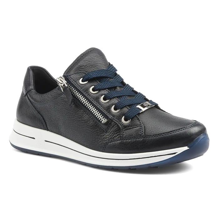 Die Low Sneakers Osaka 2.0 der Marke Ara sind für optimalen Gehkomfort und einen modernen Look ausgelegt. Diese Schuhe verfügen über ein Lederoberteil, Textilfutter und eine abnehmbare Textileinlegesohle. Die Ferse misst 20 mm und die Sohle ist aus Gummi. Details dieser Schuhe sind ein Leder Sneaker mit Reißverschluss und blaue Schnürsenkel. Die dominierende Farbe ist Marineblau, das sich mit einem Hauch von schwarzem Leder verbindet. Die Low Sneakers Osaka 2.0 sind ideal für den Alltag, ob zu Fuß, in der Freizeit oder in der Mode. Sie bieten ein funktionales Erscheinungsbild, Komfort und Vielseitigkeit, die die Erwartungen der Modeliebhaber erfüllen. -