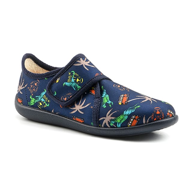 Die Newlan Pantoffeln der Marke Bellamy kombinieren Stil und Komfort und bieten ein warmes und weiches Erlebnis. Entworfen für zu Hause oder entspannende Momente im Winter, diese Textilpantoffeln verfügen über ein buntes Oberteil mit einem exotischen Tiermotiv wie Dinosaurier, Tiger und imaginäre Kreaturen in grün, orange, gelb und rot auf einem marinen Hintergrund geschmückt. Eine Stofflasche mit Kratzverschluss verleiht eine praktische Note. Die Innensohle aus Textil und Leder sorgt bei jedem Schritt für maximale Weichheit. Die strapazierfähige Gummisohle sorgt für solide Stabilität bei geringem Gewicht. Erhältlich in Marineblau, sind diese Pantoffeln Teil der funktionalen und komfortablen Auswahl, ideal für Kinder, die Wärme, Flexibilität und ein lebendiges Design suchen. -