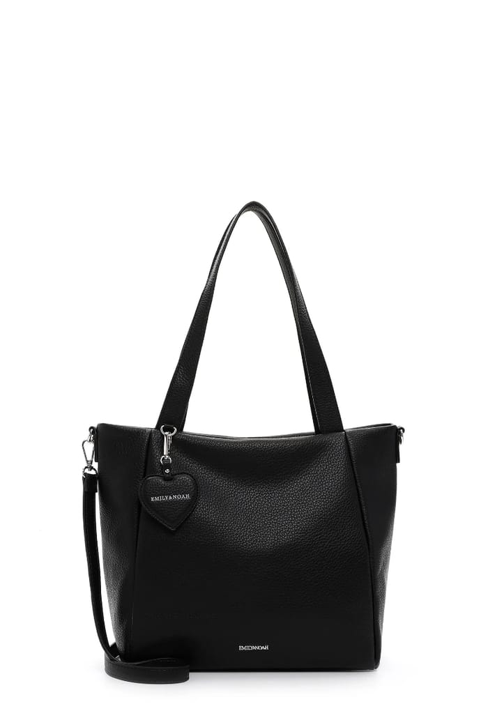 Die ENIE CITY SHOPPER Tasche der Marke Emily & Noah ist ein schwarzer Lederrucksack mit einer Kiesstruktur, mit zwei oberen Griffen und einem verstellbaren Schultergurt. Die Vorderseite der Tasche verfügt über eine kleine herzförmige Platte, die an einem Griff befestigt ist, auf dem der Name der Marke "EMILY & NOAH" eingraviert ist. Ein weiteres Emblem der Marke ist in weiß in der Nähe der unteren Mitte der äußeren Tasche gedruckt. Diese Tasche ist für Shopping, Freizeit und Ausflüge konzipiert und bietet eine perfekte Kombination aus Funktionalität, Lagerung und Transport. -