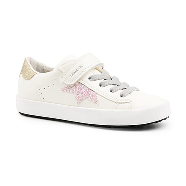 Die Geox Kilwi sind Klett-Sneaker für Alltag und Freizeit und bieten dank ihrer atmungsaktiven Sohle optimalen Komfort, der das Wohlbefinden von den ersten Schritten an fördert. Aus einer Mischung aus Synthetik und Textil gefertigt, zeichnen sich diese Sneaker durch ein elegantes weißes Design mit einem ausgeprägten grafischen Twist aus: seitlich ein metallischer pfirsichrosa Stern, graue Schnürsenkel und ein mit dem Markennamen GEOX verziertes Klettband. Ein goldenes Fersenbein fügt einen Hauch von Eleganz hinzu, während Perforationen nahe der Ferse für gute Belüftung sorgen. Die strapazierfähige Gummisohle sorgt für erhöhte Haltbarkeit, ideal für leichte Mobilität. Mit einem abnehmbaren Textilfutter und Innensohle kombinieren diese Sneaker Mode, Komfort und Vielseitigkeit in einem lässigen Stil. Geox setzt seine innovative Positionierung dank patentierter Technologien fort und garantiert einen angenehmen täglichen Einsatz ohne Kompromisse. -