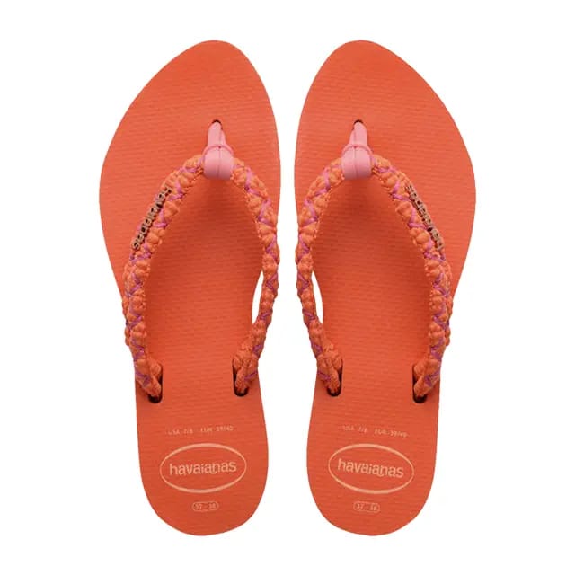 Die Havaianas Slim Point Boho sind Sommerstrandsandalen für Entspannung. Diese textilen und synthetischen Flip-Flop Sandalen sind leicht und atmungsaktiv, einfach zu tragen und zu verwenden. Ihre synthetische Sohle ist stark und langlebig. Details dieser Sandalen sind synthetische und textile Nu-Füße, die einen optimalen Fußkomfort bieten. Die leuchtend orange Farbe der Sandalen wird durch Details in rosa und lila auf den geflochtenen Bändern akzentuiert. Die Streifen sind dank einer Schlaufe verstellbar, um oben zu schließen. Die synthetischen Einlegesohlen bieten Schutz und Halt für die Füße. Die Sandalen tragen das Logo "Havaianas" in weiß auf jeder Sohle, sowie Größenangaben (USA 7/8 - EUR 39/40). -
