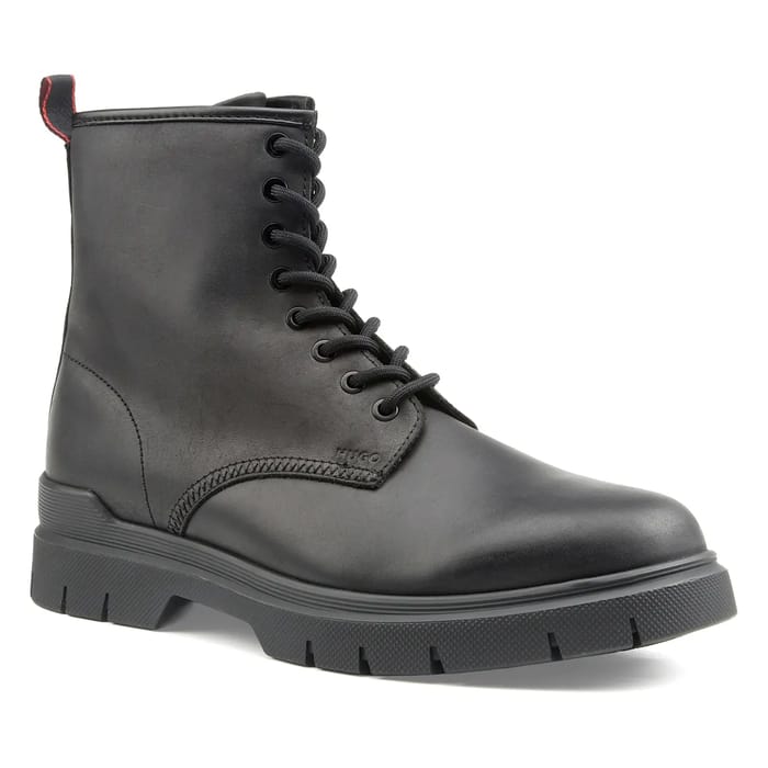 Die Lace-up Booties der Marke Hugo mit dem Namen Ryan_halb_pp sind eine ideale Wahl für kalte Herbste und Winter. Diese robusten, lässigen Stiefeletten wurden für Outdoor-Aktivitäten entwickelt und eignen sich perfekt für Arbeitsausflüge oder Winterwanderungen. Die Ryan_halb_pp Stiefeletten sind aus schwarzem Leder gefertigt und bieten ein elegantes und raffiniertes Erscheinungsbild. Ihr High Heel Design sorgt für optimalen Fußschutz und Halt, auch unter kältesten Bedingungen. Die acht Ösen für Schnürsenkel bieten große Flexibilität, um den Verschluss anzupassen und optimalen Komfort zu erhalten. Die Ryan_halb_pp Stiefeletten verfügen über eine dicke, strukturierte Ferse, mit Rillen auf der Unterseite für besseren Schutz und Verschleißfestigkeit. Die Sichtbarkeit der Nähte entlang der vorderen Teil des Stiefels, in der Nähe der Ferse Bereich, fügt einen Hauch von Detail und Qualität. Ein kleiner roter Akzent auf dem hinteren Griff verleiht den Stiefeln einen Hauch von Farbe und Persönlichkeit. Das "HUGO" Logo ist in subtilen Buchstaben über dem genähten Bereich geprägt und sorgt für einen Hauch von Stil und Raffinesse. Die Ryan_halb_pp Stiefeletten der Marke Hugo sind eine ideale Wahl für diejenigen, die eine Mischung aus Komfort, Schutz und Stil suchen. Sie eignen sich perfekt für Winterausflüge, Wanderungen oder Outdoor-Aktivitäten und bieten einen eleganten und anspruchsvollen Look für formelle Anlässe. -