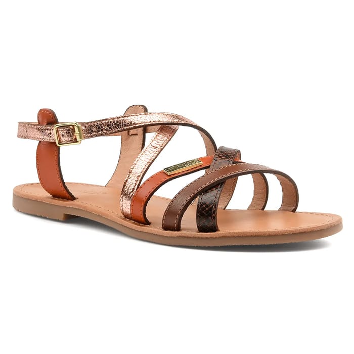 Entdecken Sie die HAPAXGUM Sandalen, eine einzigartige Kreation der Marke Les Tropeziennes. Dieses Paar flache Sandalen ist aus hochwertigem Leder gefertigt, mit einem Lederfutter für maximale Weichheit. Die Lederinnensohle sorgt für optimalen Komfort, während die Gummiaußensohle außergewöhnliche Leichtigkeit und Atmungsaktivität bietet. HAPAXGUM haben einen lässigen und sommerlichen Stil, perfekt für Ferien oder sonnige Ausflüge. Die drei breiten Bänder, die den Fuß bedecken, bieten einen Hauch von Fantasie: eine aus gold-rosa Metallic-Leder mit strukturiertem Muster, die andere aus glattem dunklem Leder und die dritte kombiniert die beiden Materialien für einen einzigartigen Stil. Eine kleine Metallplatte auf einem der Streifen enthält die Markeninformationen. Ein breit verstellbarer Verband mit goldener Schnalle sorgt für eine präzise Passform und optimale Sicherheit. HAPAXGUM sind ein Paar Sandalen, die sowohl Eleganz und Funktionalität bieten, ideal für den Alltag oder für Sommerausflüge. -