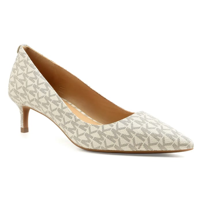 Die ALINA FLEX KITTEN Pumpen von Michael Kors vereinen Chic und Eleganz in elegantem Design. Hergestellt in einer Synthetik mit subtilen geometrischen Mustern in Ecru und Weiß, bieten diese Schuhe einen modernen und raffinierten Look. Das synthetische Obermaterial ist mit weichem Leder gefüttert und sorgt für Komfort und Weichheit beim Tragen. Die Ledersohle passt perfekt zum Fuß, während die synthetische Laufsohle für dezente Stabilität sorgt. Der 45 mm Absatz bringt eine dezente und schlanke Höhe, ideal für Abende, Events oder ein Büro-Outfit. Die ikonische Michael Kors Signatur auf der Sohle verstärkt ihre Modeidentität, die durch ein anerkanntes Know-how gekennzeichnet ist. Dieses Modell verkörpert zeitgenössische Raffinesse, perfekt für diejenigen, die einen Hauch von zeitlosem Stil suchen. -