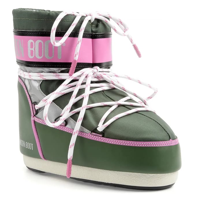 Die ICON LOW SPACE RACING warmen Stiefeletten von Moon Boot kombinieren Stil und Funktionalität in einem eleganten und vielseitigen Design. Aus einem strapazierfähigen Kunststoff gefertigt, bieten sie dank ihres synthetischen Schaumstofffutters und ihrer Einlegesohle, die effektiv vor Kälte isolieren, dauerhaften Komfort. Die dicke, flache, cremefarbene Gummisohle sorgt für solide Stabilität auf eisigen oder schneebedeckten Böden. Das synthetische Top, verziert mit grafischen Details mit einem rosa Band um die Spitze, fügt einen modernen Twist hinzu, während die weißen Schnürsenkel und geprägten "MOON BOOT"-Text ihre erkennbare Identität verstärken. Diese Stiefel sind für den täglichen Gebrauch in allen kalten Jahreszeiten geeignet und bieten sicheren Halt und konstante Wärme. Erhältlich in grün, sind sie Teil eines schicken, komfortablen und funktionalen Sortiments für ein warmes und stilvolles Outfit jeden Tag. -