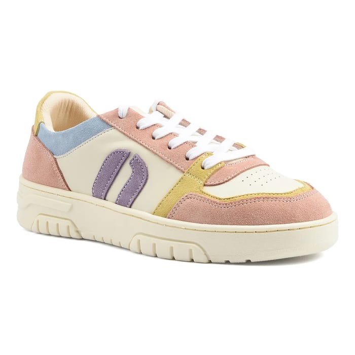 Die Low Sneakers Nora 2019 von der Marke Odaje ist eine Trend- und Modekreation, die Komfort und Vielseitigkeit vereint. Diese Schuhe, entworfen für Alltag, Wandern und Freizeit, verfügen über ein buntes Design mit Wildleder Abschnitte in hellrosa, creme, lila und gelb. Top und Obermaterial sind Veloursleder und Leder, während das Futter aus Textil besteht. Die Innensohle besteht auch aus Textil und die Sohle aus Gummi. Zu den Details dieser Leder- und Samtleder Sneaker gehören weiße Schnürsenkel durch Metallösen und eine gepolsterte Lasche für optimalen Komfort. Eine unverwechselbare lila Wildleder "V" Form auf der Seite Panel fügt seine einzigartige Erscheinung. Die Zwischensohle ist dick und weiß und bietet sowohl Stil als auch Unterstützungspotential. Die Außensohle verfügt über ein strukturiertes Muster, das ein dynamisches Erscheinungsbild bietet. Der Low Sneakers Nora 2019 ist ein Paar modische Sportschuhe, die modische Elemente mit praktischer Schuhfunktion verbindet. -