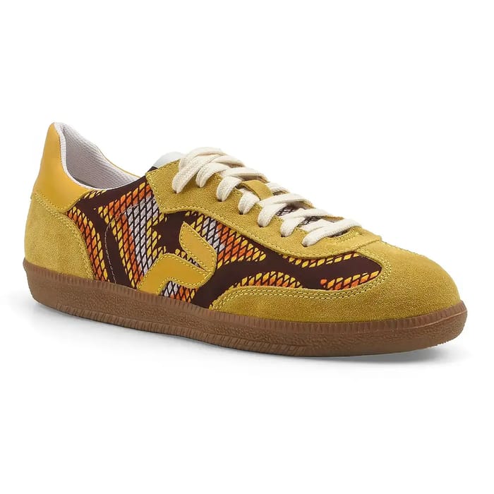 Die Sneaker Sahara der Marke Panafrica vereinen Eleganz und Langlebigkeit für einen zeitlosen Stil. Entworfen für den Alltag, zeichnen sich diese Schuhe durch ihr Samtleder und recycelte Baumwolloberteile aus und bieten sowohl Weichheit als auch Widerstandsfähigkeit. Das Textilfutter sorgt für optimalen Komfort, während die abnehmbare und textile Innensohle eine individuelle Passform ermöglicht. Die Gummisohle sorgt mittlerweile bei jedem Schritt für Stabilität und Leichtigkeit. Das kühne Design, geprägt von bunten geometrischen Mustern in Orange, Rot, Schwarz und Weiß, bringt eine dynamische und moderne Note. Der gelbe Senf aus Samtleder, verstärkt durch kontrastierende Details, macht es zu einem unverzichtbaren Stück, um Ihre Alltagsoutfits zu sublimieren, sei es urbane Spaziergänge oder Momente der Entspannung. Perfekt vielseitig verkörpern diese Sneaker die ideale Kombination aus Mode und Komfort, für einen trendigen Look, der sich jedem Stil anpasst. -
