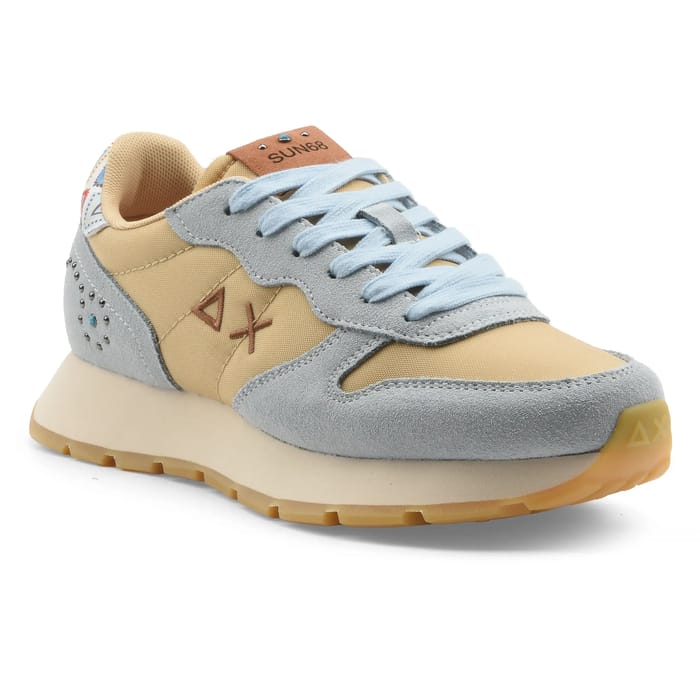 Sun68 ALLY STUDS sind vielseitige Sneaker, die Stil und Komfort für den Alltag kombinieren. Ihr weiches und strapazierfähiges Textil Wildleder-Top kombiniert mit einem abnehmbaren Textilfutter für eine perfekte Passform und einfache Wartung. Die Innensohle, auch textil und austauschbar, sorgt für eine optimale Unterstützung des Fußes, während die synthetische Außensohle eine dauerhafte Unterstützung bietet. Der 30 mm Absatz sorgt für ein natürliches Gleichgewicht, ideal zum Wandern oder zur Freizeitgestaltung. Dieses Modell zeichnet sich durch sein mehrfarbiges Design aus, das helle Töne von Beige und Grau auf Samt und Textil kombiniert und durch blaue Schnürsenkel ergänzt wird. Braune Nähdetails und dezente Logos, wie das "AX"-Emblem in der Nähe der Buttress und ein kleines dreieckiges Logo auf der Vorderseite, verstärken seine Identität. Der Zungenlederpatch, gestempelt "SUN68", verleiht einen Hauch von zeitloser Eleganz. Perfekt an aktuelle Trends angepasst, verkörpern diese Sneaker den Fashion-Geist und bleiben für den Alltag zugänglich. Ihr Design vereint kühne Ästhetik und dezente Funktionalität für stilvolle und dennoch komfortable Schritte. -