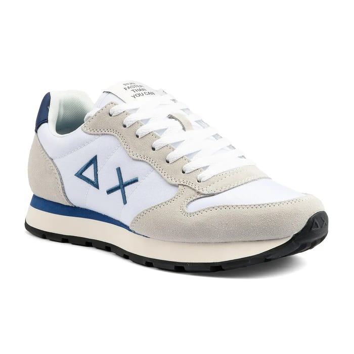 TOM SOLID, ein Paar Sneakers der Marke Sun 68, ist ein Trend- und Modeangebot für Style-Liebhaber. Dieses Paar Turnschuhe ist für Tage des Gehens, der Freizeit oder des Alltags entworfen, mit einem vielseitigen Design, das jedem Geschmack gerecht wird. Das TOM SOLID Paar zeichnet sich durch ein textiles Wildleder oben und oben aus und bietet optimalen Komfort. Das Futter ist auch aus Textil gefertigt und verleiht einen Hauch von Leichtigkeit und Flexibilität. Die Innensohle ist abnehmbar und aus Textil gefertigt, wodurch Reinigung und Wartung erleichtert werden. Die Laufsohle ist aus synthetischem Material gefertigt und bietet außergewöhnliche Festigkeit und Haltbarkeit. Die Ferse misst 25 mm, was einen festen Halt und Stabilität beim Gehen garantiert. Das TOM SOLID Paar zeichnet sich durch sein einzigartiges Design aus, das Samtleder und Textil kombiniert. Die Hauptfarbe ist weiß, mit Akzenten in beige für die Seitenwände und die Ferse. Blaue Akzente sind ebenfalls vorhanden, darunter ein dreieckiges Logo in der Nähe der Schnürsenkel und ein kleines "AX" in dunkelblau an der Seite des Fersens. Details in Marineblau sind auch um den Kragen und die Zunge herum vorhanden, wo man "schneller laufen als man kann" lesen kann. Das Paar TOM SOLID ist ein modischer und trendiger Vorschlag, der die Erwartungen der Liebhaber von Stil und Komfort erfüllt. -