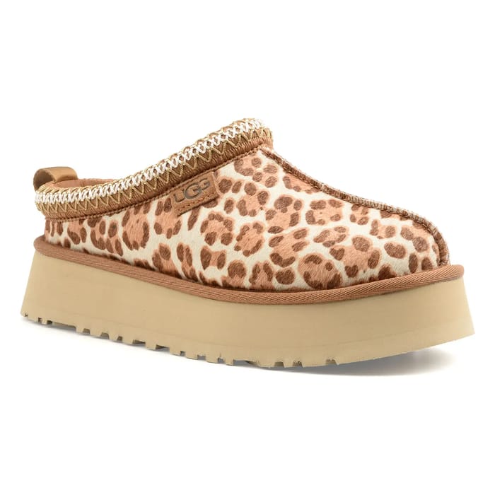 Die W TAZZ Pantoffeln der Marke Ugg kombinieren trendigen Stil mit absolutem Komfort. Entworfen für Entspannung und Innenmomente, bieten diese Rindsleder Schuhe außergewöhnliche Weichheit dank ihrer Schaffellfutter und Innensohle. Die Leoparden Rindsleder Top fügt eine ikonische und elegante Note, während die dicke synthetische Sohle bietet diskrete Stabilität. Ein dekoratives Bias-Finish unterstreicht das Design und eine kleine Rückenschlaufe macht das Tragen leicht. Ideal für den Winter, zeichnen sich diese Pantoffeln als Must-Have für den täglichen Komfort aus und verbinden Wärme, Flexibilität und durchsetzungsstarken Stil. -