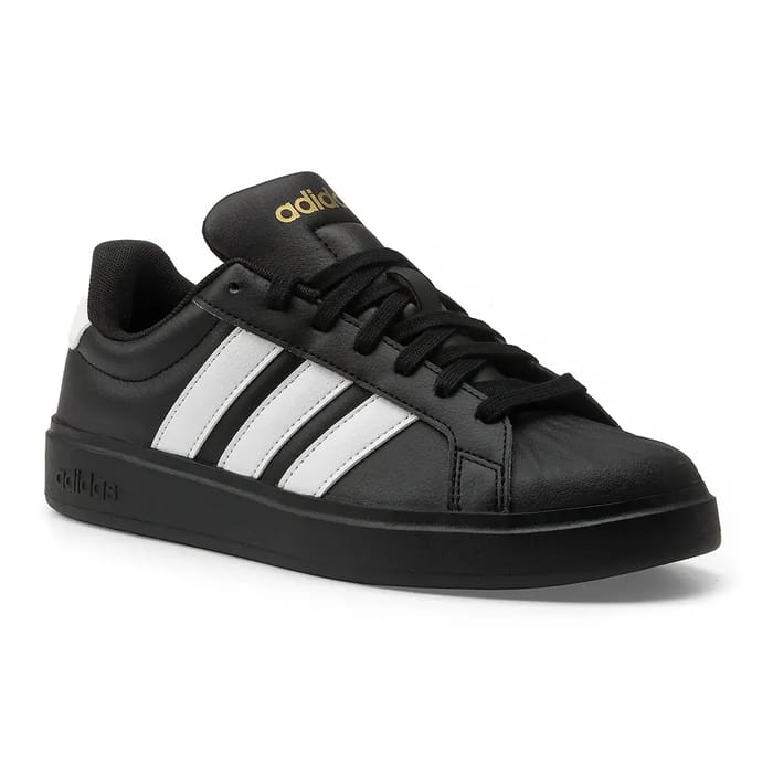 The STREETTALK shoes from Adidas combine style and comfort on a daily basis. Designed in a synthetic upper, they offer an elegant and modern silhouette, perfect for casual wear. The smooth top and the detail of the white side stripes bring a trendy touch that adapts as well to walking as leisure outings. The rubber sole ensures discreet stability, while the textile inner lining ensures lasting comfort. The iconic gold logo on the tongue enhances the fashion appearance of this versatile sneaker, ideal for everyday use. Available in black, this model embodies timeless style with a contemporary twist. -