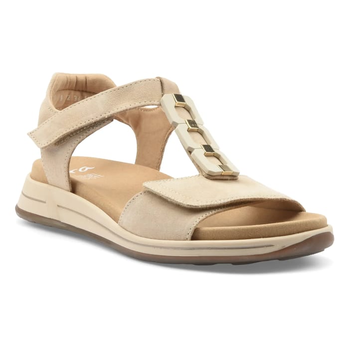 The Osaka sandals from Ara combine elegance and comfort for a day without compromise. Designed in a soft and durable velvet leather, they perfectly fit the shape of the foot while offering optimal breathability thanks to their lightweight synthetic sole. The suede upper, enhanced with delicate metal inserts, brings a sophisticated and timeless touch, ideal for a casual or summery style. The 25 mm heel ensures discreet stability, while the removable, padded leather insole ensures extended comfort, whether on the beach, on vacation or in the everyday. The beige color, both neutral and timeless, adapts to all outfits. Ara, a brand committed to foot well-being, has thought every detail to combine performance and aesthetics, making these flat sandals a must-have for a perfect day. -