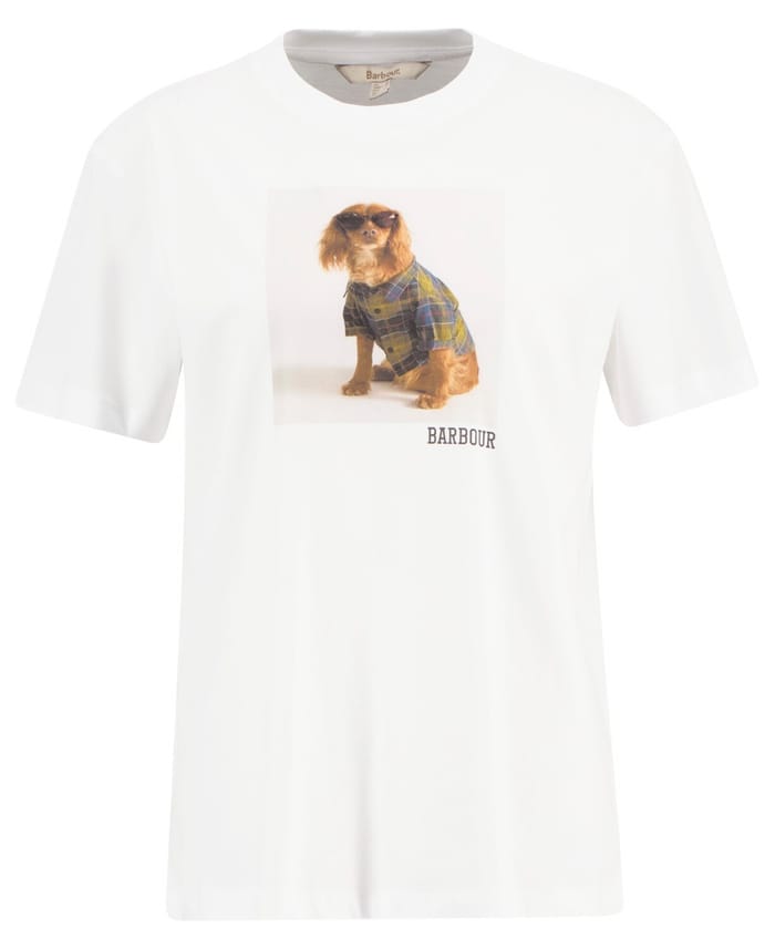 This T-shirt W's MARINE by Barbour combines simplicity and style for a casual everyday look. Designed in a timeless white, this basic model adapts to any occasion, whether it's a work day, a relaxing moment or an outing with friends. Its breathable fabric ensures optimal comfort, even in warmer weather, while its classic fit makes it a wardrobe staple. The sober design is enhanced by a touch of originality: a delicate impression representing a small stylized dog, dressed in a plaid and glasses, which brings a playful and timeless note. The Barbour brand, synonymous with quality and durability, discreetly affixes its name to the bottom right, recalling the heritage of excellence of the manufacturer. Versatile and timeless, this T-shirt embodies the perfect balance between minimalist elegance and effortless relaxation. -