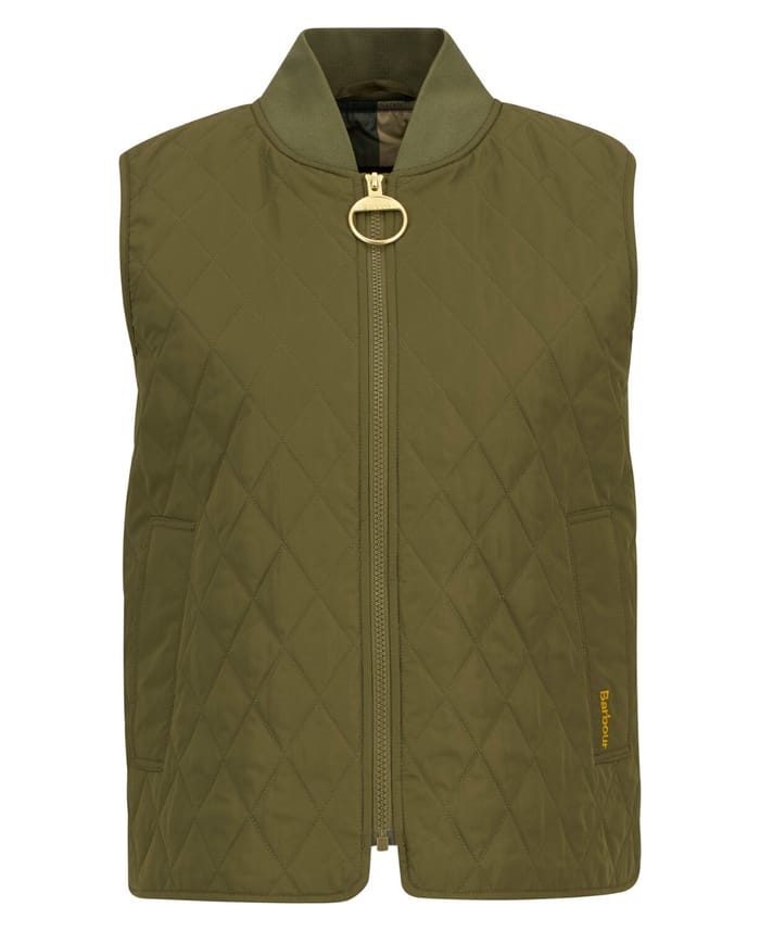 This W's ROEBURN vest from Barbour combines timeless elegance with practical functionality to fit any occasion of the day. Designed in a timeless khaki, this model embodies the casual and chic spirit of the brand, while remaining perfectly versatile for work, outings or moments of relaxation. Its lightweight, sleeveless fit makes it an ideal ally for intermediate seasons, where the need for warmth blends with a search for style. The quilted structure, adorned with a carefully stitched diamond pattern, brings both a stylish aesthetic touch and optimal thermal insulation, ensuring lasting comfort. The high collar, typical of Barbour, reinforces this protection while providing an extra touch of elegance. The central zipper, enhanced by a golden metal ring, ensures a secure closure and adds a subtle note of sophistication. The discreet embroidering of the Barbour logo in yellow thread on the chest recalls the brand's artisanal heritage, while the neat details, such as the quality of the stitching and materials, attest to an unparalleled know-how. Lightweight and breathable, this vest combines robustness and comfort for days when style should not sacrifice well-being. A must for those looking for the perfect alliance between utility and distinction. -