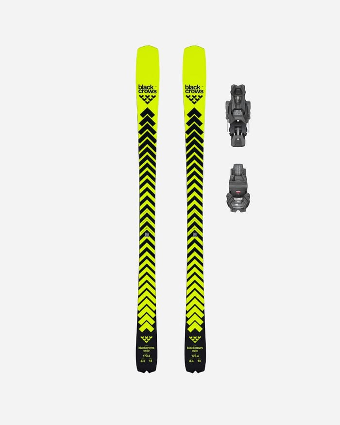The M's Octo + ATTACK LYT 13 GW DEMO BR.95[F]s.bk from Black Crows are part of the category of piste skis, designed for demanding fans of performance and control. Featuring a bold design and functionality, these skis feature a vibrant aesthetic with a bright yellow finish and black rafter patterns that underline their dynamism. Their technical structure offers optimal stability in rapid descent, while ensuring increased maneuverability for precise and responsive turns. Ideal for alpine skiing in competition or for leisure trips, these skis meet the requirements of hardcore skiers thanks to their range of functional and technical products. The entire design features meticulous attention to detail, with a black Crows inscription in white on a black background near the bindings, as well as technical specifications clearly indicated along the ski. -