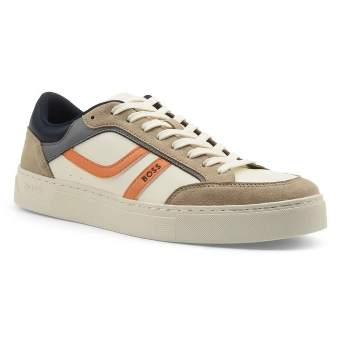These Rhys Tenn lace-up shoes from the BOSS brand combine timeless elegance with everyday versatility. Designed in a neat synthetic, they perfectly fit the shape of the foot while offering optimal comfort, ideal for business trips or casual outings. Their textile lining ensures a pleasant softness, while the removable and textile insole allows easy maintenance and adaptation to the morphology of the foot. The sturdy, textured rubber sole guarantees increased durability even after intensive use. The sober and timeless design, marked by beige accents and a touch of understated refinement, makes it a versatile choice for everyday use. Perfectly suited to a classic style, these BOSS sneakers embody the successful combination of practicality and sophistication. -