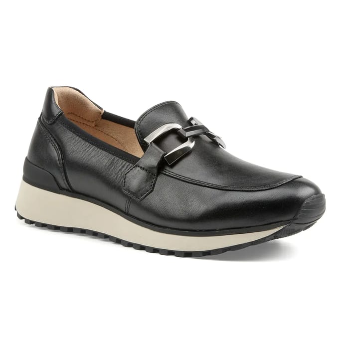 The Kaia loafers of the brand Caprice are luxury shoes that combine refinement and comfort. These classic loafers are made of high-quality leather, with jewelry inserts that add a touch of sophistication. The textile lining ensures optimal comfort, while the leather insole is removable for a better fit to the foot. The synthetic outsole offers durability and wear resistance. The heels measure 30 mm, making them perfect for formal occasions like evenings or events. The Kaia loafers are available in black, a chic and elegant color that fits all looks. With their stylish style and comfort, these loafers are ideal for office or social occasions. -
