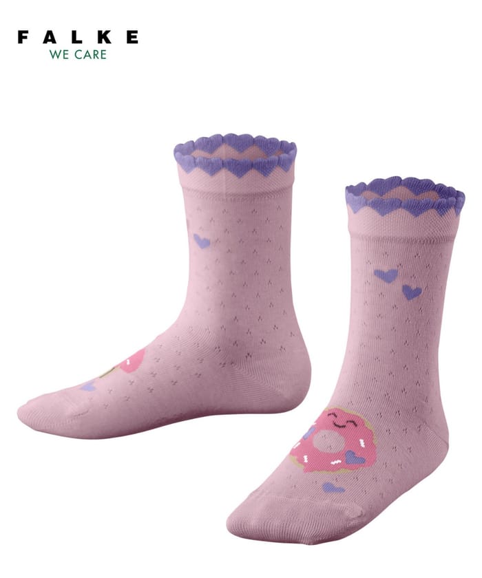 The K's Cute Pastries socks from the brand Falke combine elegance and playful touch for a stylish everyday outfit. Made from a blend of 84% cotton, 15% polyamide and 1% elastane, they offer optimal finesse, durable comfort and natural breathability. Their design is based on a pastel pink base adorned with small hearts and a pretty donut pattern on the front, while the purple lace-shaped upper border adds a distinct decorative touch. Worn in the office or on casual outings, these classic socks are part of an elegant range, where every detail reflects the know-how of Falke. The FALKE logo in black text above the mention "WE CARE" emphasizes a constant attention to the finishes and well-being of the wearer. -