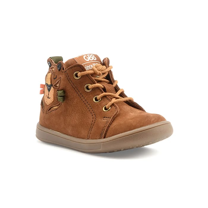 The Basile of the brand Gbb are high-end sports shoes designed for children. The brown leather nubuck top features decorative seams that form the face of an animal on the sides. Brown leather laces go through golden rings, while green fabric accents near the heel area add a splash of color. The tongue features the "G&B" logo in white letters, above a smaller text indicating "since 1980". The rubber soles ensure durability and resistance suitable for active wear. -