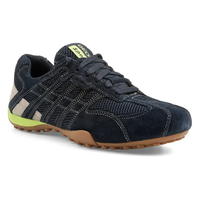 The Geox SNAKE shoes combine elegance and comfort in a versatile design suitable for both office and outings or everyday use. Made of quality textile suede, their navy blue upper combines with velvet leather details for a neat and modern aesthetic. The rubber sole offers increased durability, while the textile lining ensures a pleasant feeling of freshness. The removable leather interior contributes to a personalized fit and optimal comfort throughout the day. White stitching in the shape of geometric patterns underline the sides of the shoe, while a discreet green touch near the heel adds a distinctive touch. The Geox label on the tongue completes the design with a striking identity. Inspired by the brand's technological innovations, this sneaker embodies Geox know-how with a constant attention to well-being from the first steps. -