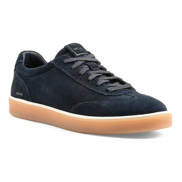 The SPHERICA ACTIF X4 lace-up shoes from Geox combine elegance and everyday comfort. Designed in navy suede material, they offer a classic and versatile look suitable for both office and outings or everyday use. The velvet leather top features a subtle perforated texture, while the grey laces and visible stitching add a touch of refinement. The rubber sole, combined with a removable leather insole, ensures lasting comfort throughout the day. An iconic gold "GEOX" inscription on the tongue and heel reinforces the brand identity, known for its breathable soles and technological innovations. This model embodies uncompromising comfort, with assertive durability and a neat fit. -