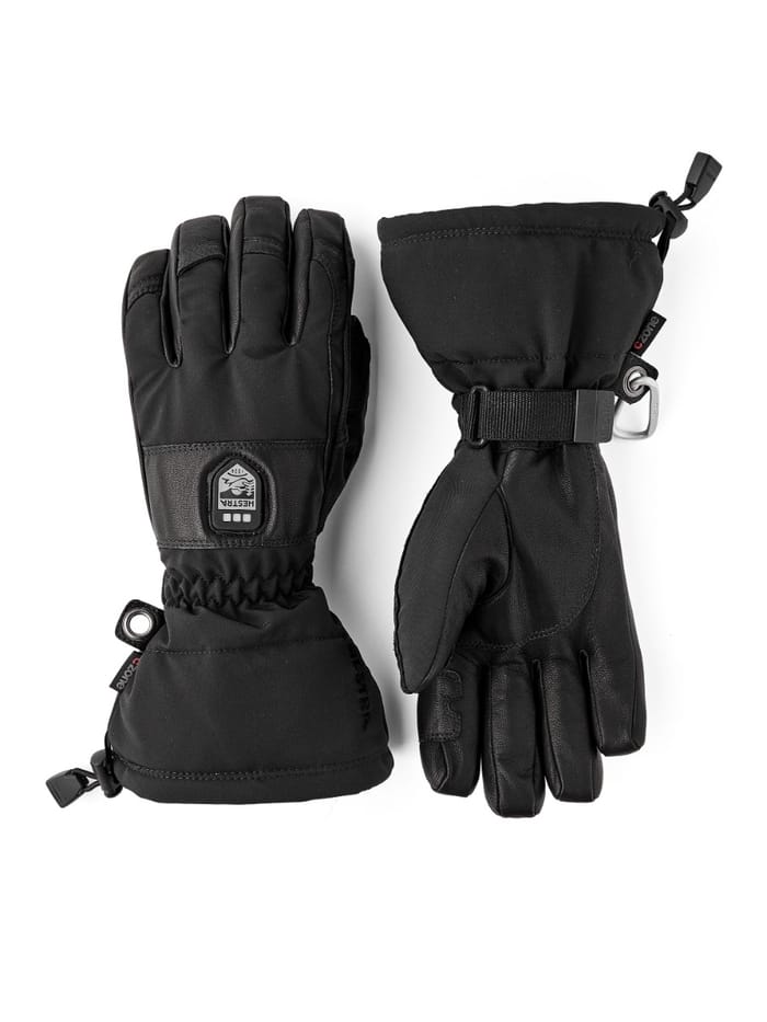 The POWER HEATER GAUNTLET ski gloves from the Hestra brand combine comfort and performance in winter conditions. Made of a durable material, these technical gloves offer lasting warmth thanks to their polyester lining, ideal for snow activities. Their functional design incorporates effective waterproofing and optimized breathability, ensuring a good thermal balance even in the event of prolonged effort. The cuffs are equipped with an adjustable strap and buckle closure, ensuring a tight and secure fit. Reinforcements enhance durability on the fingers and palm, while the wrist pull buttons make it easy to wear and remove. A logo badge on the back of one of the hands adds a touch of identity. These black gloves are particularly suitable for winter sports, offering effective protection against the cold in snowy environments. -