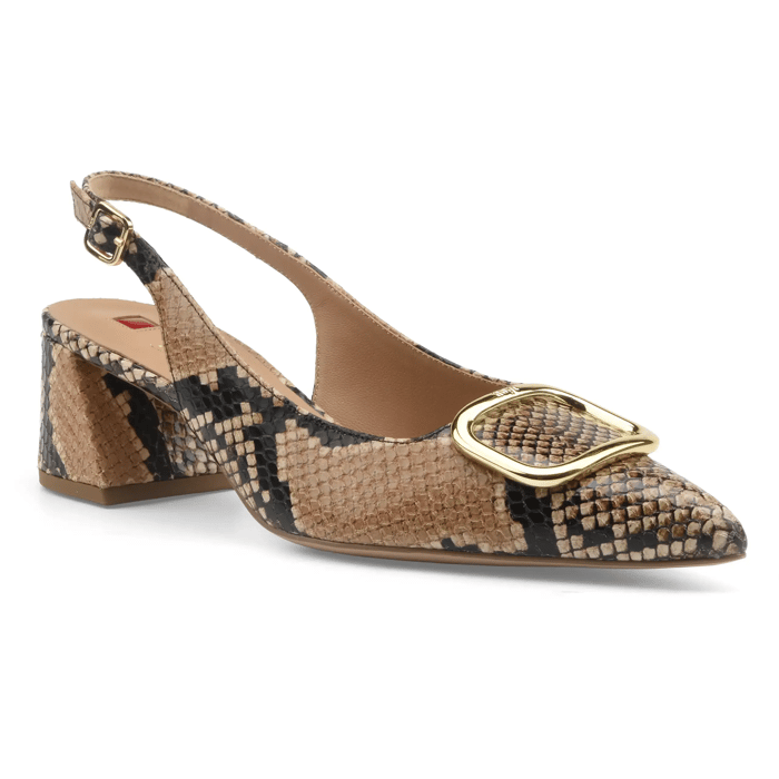 These Hogl slingback pumps combine timeless elegance with elegant sophistication, perfect for sublimating every moment of your daily life. Designed in reptile imitation leather with shades of brown and black, they capture attention with their bold style while remaining discreet. The upper and upper, entirely in leather and reptile imitation leather, espouse the silhouette with a natural softness, while the lining and authentic leather insole ensure optimal comfort, even after long hours worn. The 50 mm heel, structured and stable, brings a touch of assurance and femininity, ideal for evenings, business events or a day at the office. The neat details, such as the leather strap that elegantly wraps the back of the foot, reinforce the chic and timeless appearance of these pumps. Their design, both modern and classic, integrates with ease in a minimalist or bold wardrobe, promising to become a must-have piece. A touch of refinement for those seeking excellence in every detail. -