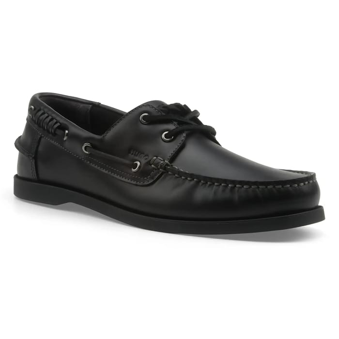 The Darcy Boat of the brand Hugo combine timeless elegance and refined comfort for summer outings or moments of relaxation. Designed in neat black leather, these boat shoes stand out for their classic moccasin design, marked by visible stitching and a polished finish that enhances their chic look. The metal details of the eyelets and discreet embroidery on the sides enhance their sophisticated character, while the rubber sole ensures discreet stability. Lightweight and breathable thanks to their textile lining, they perfectly adapt to long days or evenings in the city. Ideal for a style that is both casual and distinguished, these shoes embody the essence of a timeless look, where comfort meets elegance. -