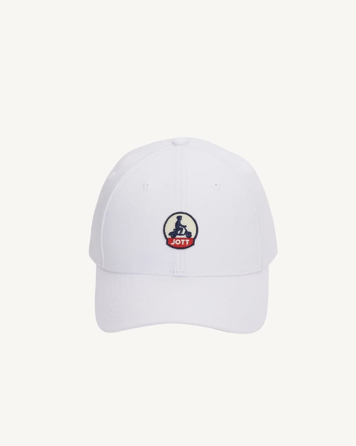 The cap CAS 2.0 of the brand Jott is a casual and sporty cap designed for outdoor activities and fashion. Made from 100% cotton, it offers lightness and freedom of movement. The cap features a classic style with a curved edge and six ventilated panels for optimal ventilation. A waxed cotton patch, adorned with an image of a person riding a scooter surrounded by a red and blue edge, is embroidered on the front of the cap. The logo "JOTT" is inscribed in capital letters below the image. The cap is available in white, an ideal color for outdoor activities and for a casual fashion outfit. -