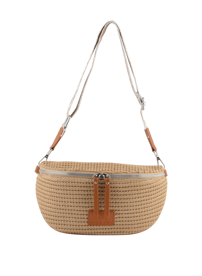 Shoulder bag BRADDIE from the Mia & joy brand, designed for outings, offices and trips. This chic and modern bag measures 26 x 14 x 10 cm and is made of synthetic for lightness and durability. The polyester lining ensures protection and ease of maintenance. The top and upper are also made of synthetic, providing strength and ease of maintenance. The bag features a silver zip closure, secured by two brown leather buttons that fit perfectly when closed. The white adjustable shoulder straps, equipped with metal clasps, allow an easy and comfortable adaptation. A small leather label is visible on one of the shoulder straps, near the attachment point. The bag has a rounded shape and an oval base, with an original detail in the shape of a synthetic banana. The beige color is ideal for everyday use. -