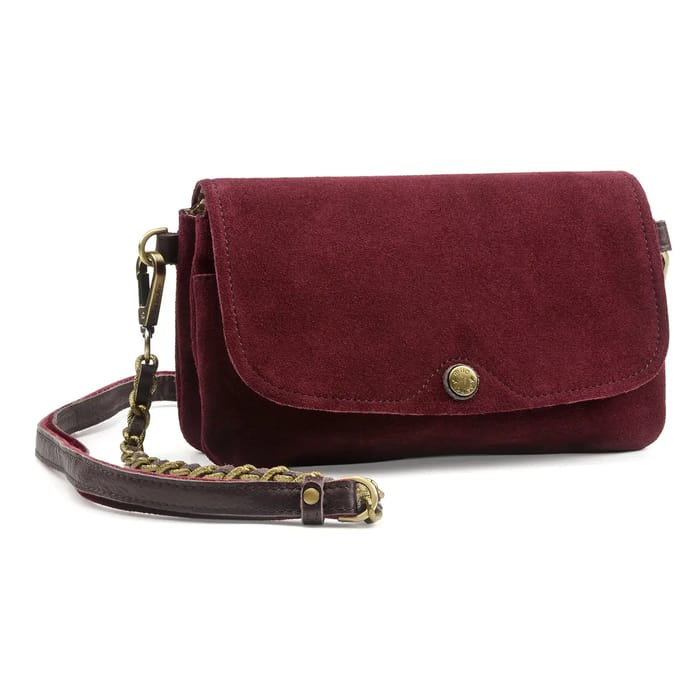 The ODILE bag from the brand Mila Louise combines elegance and practicality in a classic design. Its burgundy suede finish brings a stylish twist, while the gold button closure on the flap adds a touch of sophistication. The bag is worn indifferently on the shoulder thanks to its adjustable brown leather shoulder strap with clasp and braided chain details. The polyester interior offers secure and organized storage, ideal for office, outings or everyday use. The contrasting overlocks elegantly highlight the external seams, thus reinforcing the quality of the construction. This model combines stylish accessory and functionality for a perfectly controlled fit. -