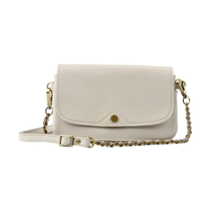 The Odile flap bag from the brand Mila Louise combines timeless elegance and everyday convenience. Designed in off-white leather, this model stands out for its slightly grainy texture, bringing a stylish touch to its classic appearance. The flap closure, secured by a gold snap button, ensures discreet protection for your business, while the polyester lining provides optimal protection against shocks and wear. Ideal for both office and outings, this versatile bag features an adjustable strap combining leather and twisted chains finished in golden tone, offering both strength and style. A side cap allows to adjust the length according to your preferences, while a metal label decorated with a delicate pattern adds a note of authenticity. Perfect to carry your essentials with discretion, this bag combines practical storage and security, while remaining an essential accessory to sublimate each outfit. -