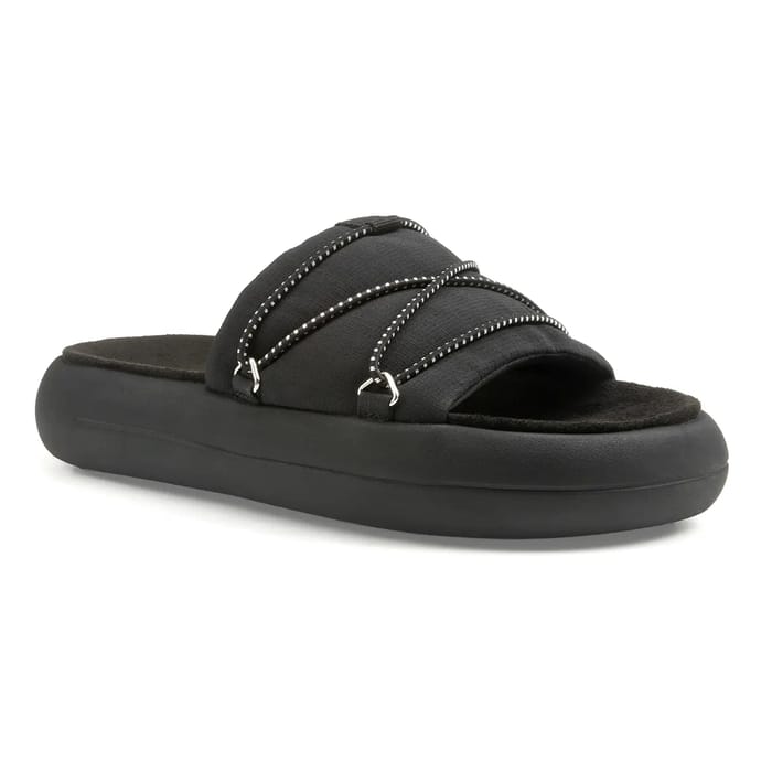 The MB ICON SLIDE mule from Moon Boot combines comfort and style in a model ideal for everyday life and summer outings. Its lightweight textile top and soft inner lining ensure a pleasant all-day wear. The EVA and rubber sole offers remarkable lightness and good support, while the 40 mm heel provides discreet stability. Three wide straps adorned with silver chain detailing add a fashion touch to this stylish black pattern. Perfect for relaxation or informal moments, this mule is suitable for indoor use as well as summer outings. Its sleek design and comfortable appearance make it an essential ally for a casual wardrobe. -