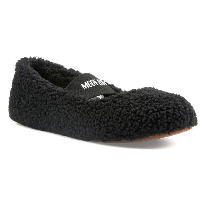 The MB SHEARLING BALLERINA slippers from Moon Boot combine comfort and style for a warm and soft experience. Made in a soft and fluffy shearling, these slippers offer optimal warmth thanks to their shearling upper and textile lining. The textile insole fits the foot perfectly, while the EVA and rubber outsole ensures lightweight stability and increased durability. With a 10 mm heel, they combine lightness and comfort for a flexible walk. The sleek black design highlights their elegant appearance, ideal for home or moments of relaxation in winter. The brand name is engraved white on the flange, adding a distinctive touch. These slippers fit into the functional and comfortable range, offering warmth, softness and flexibility for everyday indoor use. -