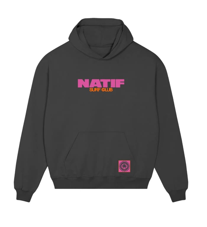 This Natif Hoodie Loose Surf Club combines casual style with optimal comfort for everyday use or moments of relaxation. Designed in a soft and warm fabric, it is perfect for cool days or cozy evenings. The removable hood and cuffs as well as the waist lined with elastic ribbons enhance its versatile side, adapting to any occasion, from outdoor leisure to a lounge outfit at home. The front features the "NATIF SURF CLUB" logo in thick, dynamic letters with pink and orange gradients, adding a vibrant twist to this black model. A handy Kangaroo pocket and a small decorative circle-shaped patch on a pink background, located near the chest, bring subtle details that reinforce the identity of the product. Ideal for those looking for a garment that is both trendy and timeless, this hoodie embodies the relaxed and warm spirit of the brand. -