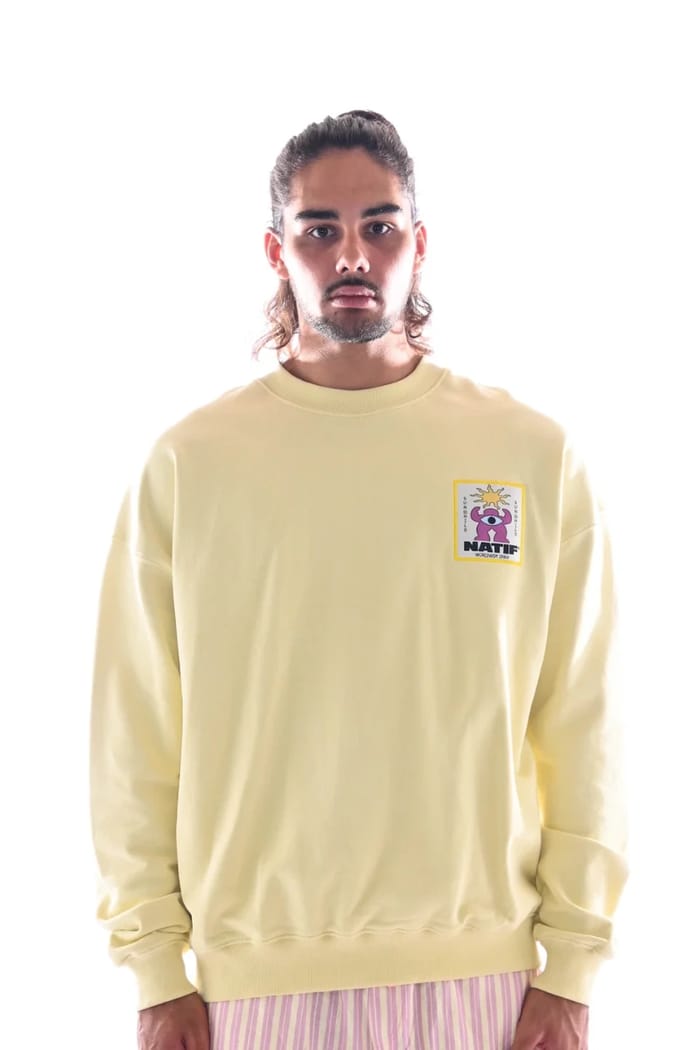 The sweatshirt SWEAT LOOSE SUNCHILD of the brand Natif embodies the perfect combination of relaxation and comfort. Designed for everyday use, this round neck model is distinguished by its cozy style, ideal for moments of relaxation or leisure. Made in a warm fabric, it guarantees a feeling of well-being at every port. Its iconic design highlights a unique graphic touch: a square patch on the left chest representing a cartoon character with a mischievous eye, topped by a radiant sun. Around this illustration, Japanese characters add a touch of originality, while the word "NATIF" in bold letters reinforces the brand identity. The bright yellow color brings a cheerful and dynamic energy, perfect for those who love to combine style and personality. Versatile and timeless, this sweatshirt fits as well in a casual outfit as in a more urban look, while remaining a must for lovers of parts that are both comfortable and stylish. -