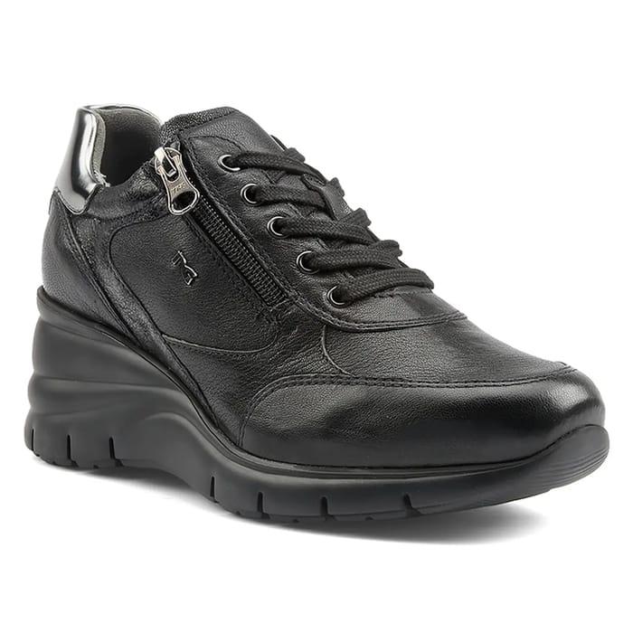 The Agosta sneakers from the Nero Giardini brand are designed for fashion lovers who want to combine comfort and elegance. These wedge heel shoes are made of leather and synthetic, offering a leather lining for a feeling of maximum comfort. The textile and removable insole ensures a perfect fit to your foot. The heel measures 60 mm, offering an ideal height for outings and leisure. The shoe details, such as the wedge heel leather sneaker, add a touch of elegance to its design. The black color is a classic and versatile option that will suit all styles. The Agosta sneakers are perfect for everyday occasions, outings and leisure, and stand out for their unique Made in Italy style. -