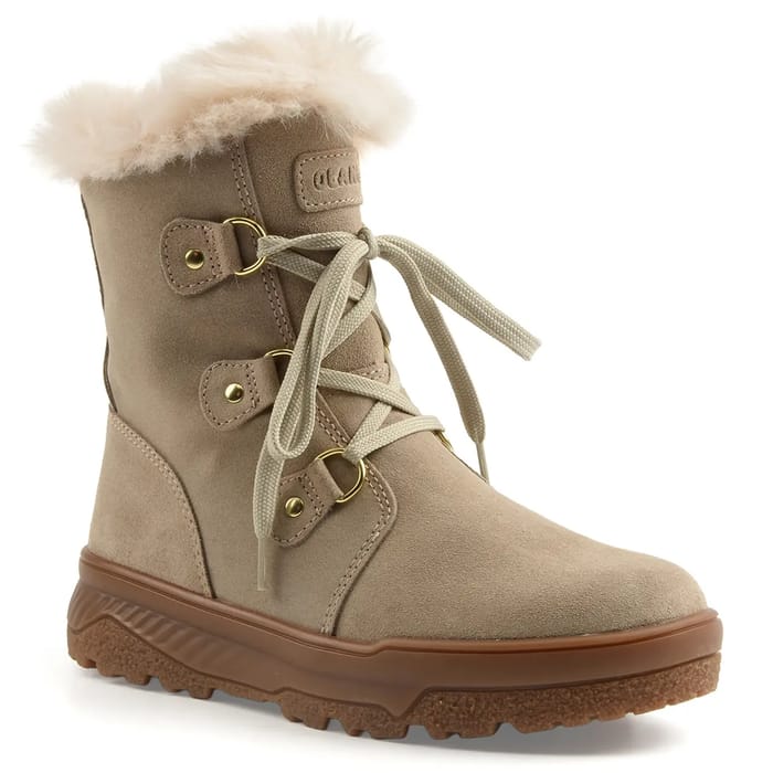 The warm SIVIGLIA boots from Olang combine elegance and comfort on a daily basis. Designed in a soft beige suede, they feature a warm textile inner lining for lasting warmth. The removable textile insole offers optimal comfort while facilitating maintenance. The 35 mm heel ensures discreet stability, while the thick rubber sole ensures durability and resistance to weathering. A neat detail, the velvet leather upper edge enhanced with natural fur, adds a warm and stylish touch. The lace closure system with gold metallic artwork enhances support, ideal for general use. This chic and versatile model is part of a range of comfortable products, perfectly suited for everyday use in winter. -