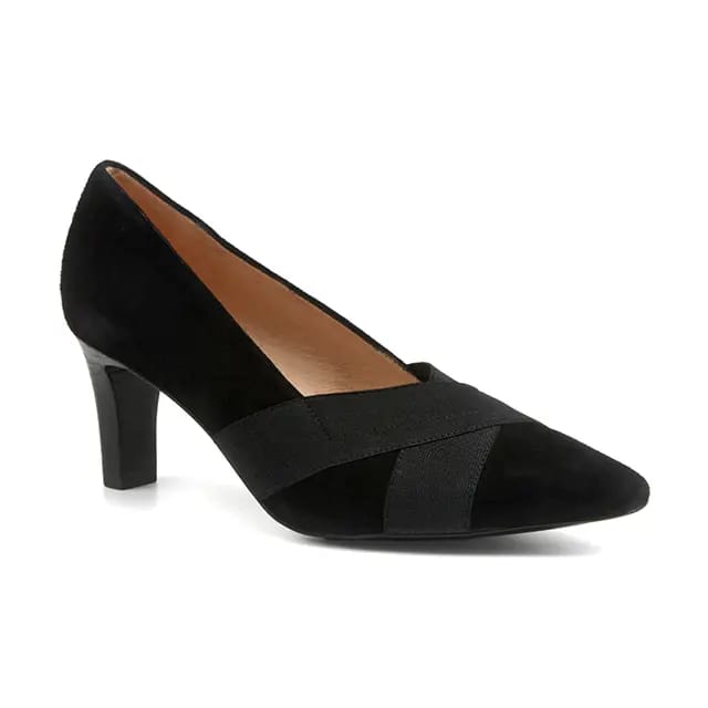 The Peter Kaiser pumps, reference 9-72443-44, are elegant shoes designed for formal or professional occasions. Their upper and stem are made of textile suede, offering exceptional softness and flexibility. The leather lining adds a touch of refinement and comfort. The leather insoles guarantee extra support and cushioning. The synthetic outsoles ensure durability and wear resistance. The heels measure 65 mm, offering a modest height while maintaining an elegant look. The details of the pump, such as velvet leather and textile, create a chic and sophisticated style. The black color is ideal for evenings, events or the office. These pumps are designed to appeal to those who appreciate style, refinement and fashion. -