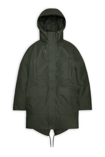 The parka Rains 21460 Nome Long Parka W3T3 is a green military style garment, designed for winter and rainy conditions. This long parka is equipped with a cap and a front clasp for optimal protection against the weather. It features several pockets on the chest and bottom to store your accessories, as well as adjustable cords to the belt and cap for a personalized fit. The pockets are fitted with clasps for added security. The parka is made of 100% polyester lining, ensuring effective waterproofing and insulation. It is a functional and urban garment, ideal for rainy days or for outings in winter. -