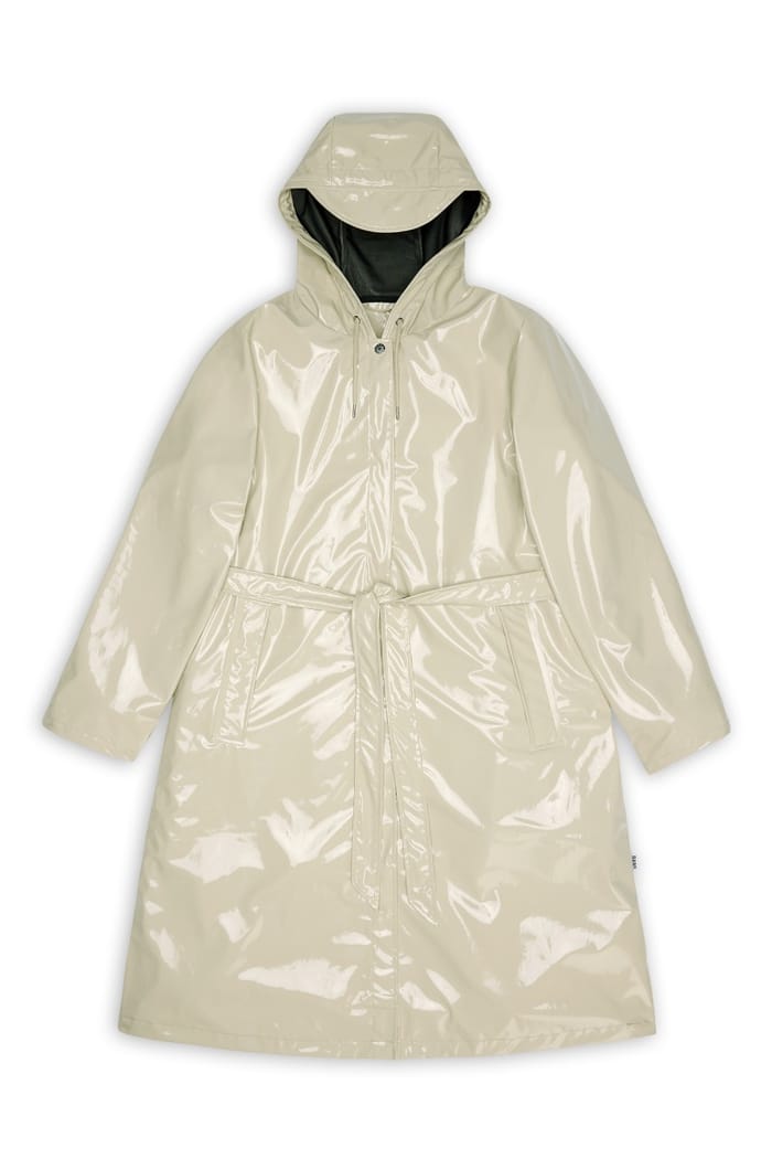 The Rains W's 12040 A-Line Longer W Jacket W3 waterproof coat combines elegance and functionality in a modern trench coat design. Designed to withstand rain, wind and changing weather conditions, this coat offers optimal protection thanks to its waterproof and breathable fabric. Its elongated A-cut highlights the silhouette while ensuring increased comfort. A zipper on the front extends from the top of the coat to height of the waist, while the waistband adjustable by cord allows to adjust the silhouette according to the wearer. Two hip-height side pockets add to its practical utility. The beige exterior fabric with bright highlights contrasts with the dark-colored interior, bringing a touch of modernity. A discreet label is located in the lower right corner. This functional and elegant coat is an ideal ally for mid-season or rainy days. -