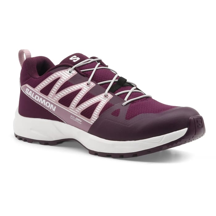 The Salomon OUTSCAPE WP are hiking shoes designed especially for young adventurers, combining performance and robustness for long mountain excursions or hiking in the heart of nature. Their textile and membrane upper offers optimal protection against the weather while guaranteeing excellent breathability, ideal for prolonged efforts. The removable textile insole allows for custom fit and easy maintenance, while the Contagrip outsole ensures reliable grip on any terrain, from rocky trails to muddy paths. The sporty and dynamic design, marked by a purple dominant enhanced by white touches and lighter shades, reflects both the energy and style of outdoor enthusiasts. Technical details such as the "SALOMON" logo associated with "S-LAB" and "S-LAB ULTRA" underline the brand's commitment to innovation and quality, with elements such as the pull tab at the back for a streamlined donning. Perfect for trekking and outdoor recreation, this shoe combines comfort, durability and versatility for limitless adventures. -