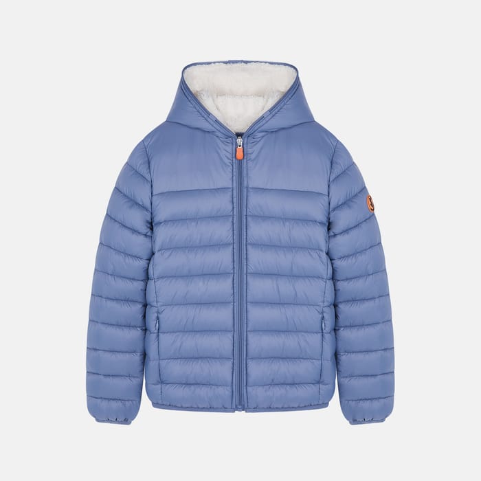 The K's Rob jacket from Save the duck is a casual and chic outfit for everyday wear, ideal for work or outings. This sky blue jacket is designed to offer optimal comfort, with cushioning sections created by horizontal stitching for effective insulation. The front closure is equipped with an orange closure button, while a red and black embroidered patch near the left shoulder adds a touch of style. The sleeves feature elasticated cuffs for an accurate fit and a comfortable fit. The inside of the cap is lined with white wool for additional insulation. The K's Rob Jacket is a smart choice for cold days, offering both protection and style. -