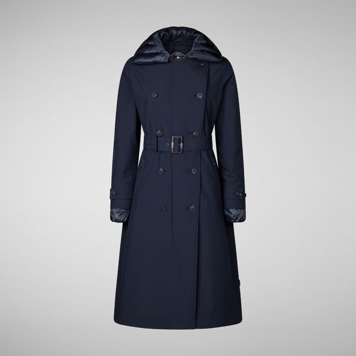 The W's D42328W GRIN21 GABRIELLE coat from the Save the duck brand embodies an elegant and casual style, perfect for urban winter wear. Designed as a trench coat, it stands out for its navy fabric outer fabric and 100% recycled polyester integral lining, providing warmth and comfort while respecting the environment. Its wide collar and adjustable belt with square buckle enhance its structured silhouette, while the black buttons in two vertical rows add a touch of modernity. The long sleeves with buttoned cuffs and an additional fabric detail bring functional elegance. The inside of the collar is lined with quilted dark matter, enhancing warmth and aesthetic contrast. Two visible pockets on the front complete its balanced look, ideal for both office and city outings. This coat combines low-weather protection, discreet warmth and timeless style. -