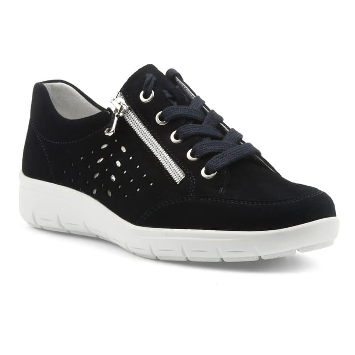 The Semler GRETA H combines timeless elegance with urban style for a versatile sneaker, ideal for everyday occasions such as city walks or leisure. Designed in a silky suede, this shoe breathes thanks to thin lateral perforations, guaranteeing optimal comfort throughout the day. The leather lining, removable for easy maintenance, adds a touch of luxury and durability, while the synthetic sole provides a stable and silent support. The 25 mm heel perfectly balances comfort and support, without sacrificing style. The velvet leather details on the navy-blue sneaker and shoelaces bring a touch of sophistication, while the silver eyelets enhance the modern aesthetic. A trendy sneaker, both timeless and resolutely current, for those who seek the perfect combination of fashion and comfort. -