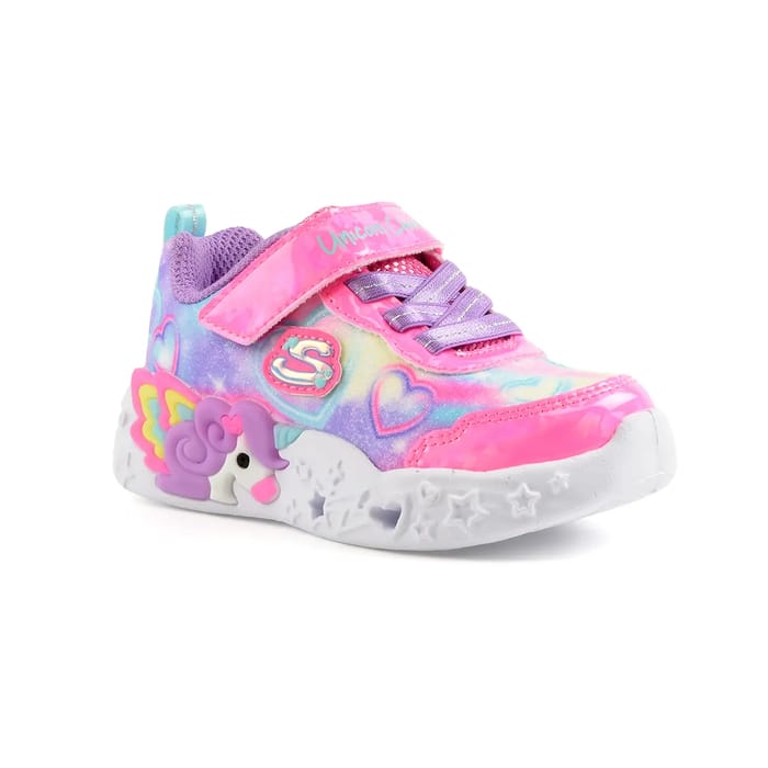 The sneakers Skechers UNICORN CHARMER combine style and comfort to offer a pleasant everyday experience. Designed in a soft synthetic material, they perfectly fit the foot thanks to a textured material upper and a practical Velcro closure. The removable textile insole ensures optimal comfort, while the rubber outsole provides discreet stability and increased durability. These pink sneakers with playful details, such as the stars and hearts patterns on the top, as well as an integrated light that lights up with every step, bring a magical touch to every outing. An iconic small 'S' on the side completes the elegant design. Ideal for leisure or a day in the city, these shoes stand out as a versatile and casual choice, combining fashion, comfort and lightness. Their colorful design and playful appearance make it an essential accessory for children who like to stand out with style. -
