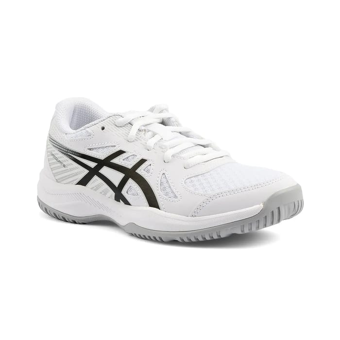 La chaussure de sport en salle UPCOURT GS de la marque Asics est conçue pour les activités physiques intenses. Cette chaussure est dotée d'un dessus en textile et synthétique, offrant une combinaison de respirabilité et de rigidité. La doublure en textile assure une douceur supplémentaire. La semelle intérieure en textile et amovible facilite le changement de semelle. La semelle extérieure en gomme est conçue pour absorber les chocs et offrir une durabilité. La chaussure est disponible en blanc, avec un logo noir sur le côté. Les lacets plats sont fixés aux œillets en tissu. La semelle extérieure est grise et texturisée pour offrir une apparence dynamique. La chaussure fait partie de la gamme LITE COURT 6, ce qui suggère qu'elle est conçue pour les performances optimales. -