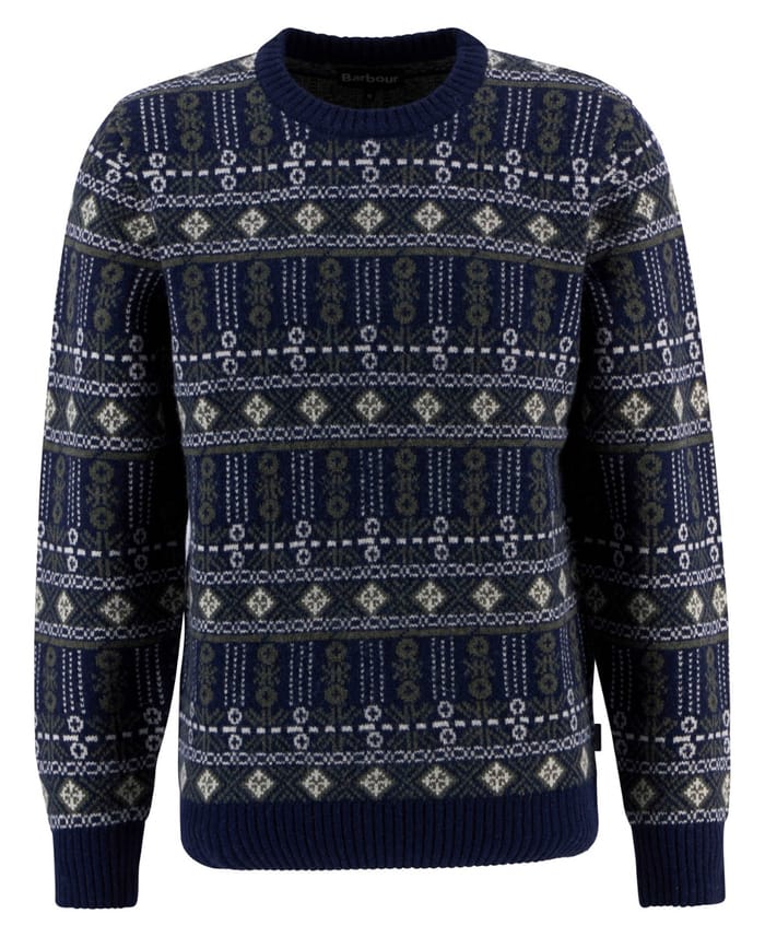 Le M's GRANGETOWN FAIR ISLE SWEAT de la marque Barbour est un pull confortable et classique pour l'hiver, le bureau ou votre quotidien. Ce pull à col rond est confectionné en bleu marine et est doté de longues manches avec des poignets en tricot pour une douceur optimale. Les motifs traditionnels de l'île de Fair, tels que des losanges, des croix et des éléments floraux en blanc et en vert olive, sont répétés sur le corps du pull. Le col et les poignets sont en tricot bleu marine pour une touche de simplicité. Ce pull est idéal pour les jours froids et les occasions formelles ou informelles. -