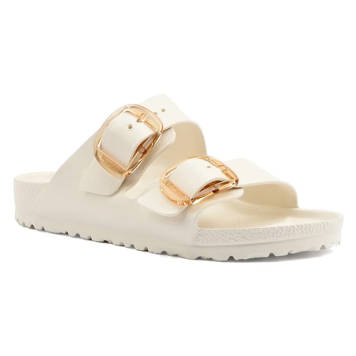 Sandales Arizona big buckle EVA N de la marque Birkenstock : ces mules décontractées et confortables sont idéales pour vos sorties estivales. Conçues avec un lit de pied en EVA pour soutenir la plante de pied, elles offrent un confort optimal tout au long de la journée. Les deux sangles ajustables en EVA, munies de plusieurs trous pour une adaptation de taille parfaite, s'associent à des boucles dorées ton sur ton. Le dessus et la semelle intérieure en EVA garantissent une légèreté et une souplesse exceptionnelles. Les sandales Arizona big buckle EVA N sont disponibles en une jolie couleur écru qui se marie parfaitement avec tout style de tenue. -