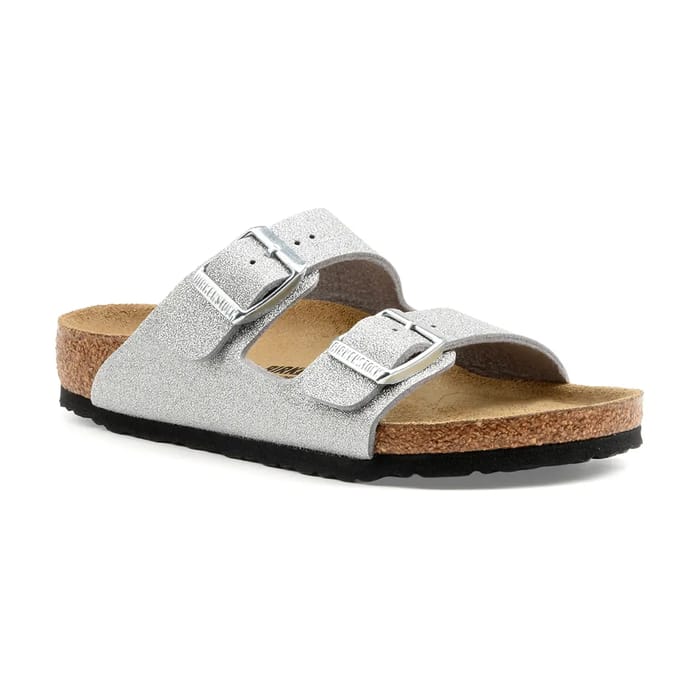 Les sandales plates Birkenstock Arizona kids allient style et confort pour les enfants. Fabriquées en Allemagne, ces sandales iconiques s'inspirent du célèbre lit de pied qui soutient naturellement la plante du pied. Le dessus en synthétique pailleté argent ajoute une touche tendance, tandis que les deux brides métalliques réglables assurent un bon ajustement. L'intérieur en tissu doux et la semelle intérieure en cuir offrent une excellente respirabilité et un confort durable. La semelle extérieure en gomme assure une bonne stabilité sans compromettre la légèreté. Idéales pour la plage, les vacances ou le quotidien, ces mules conviennent parfaitement à une tenue décontractée et estivale. Un accessoire mode incontournable pour l'été. -